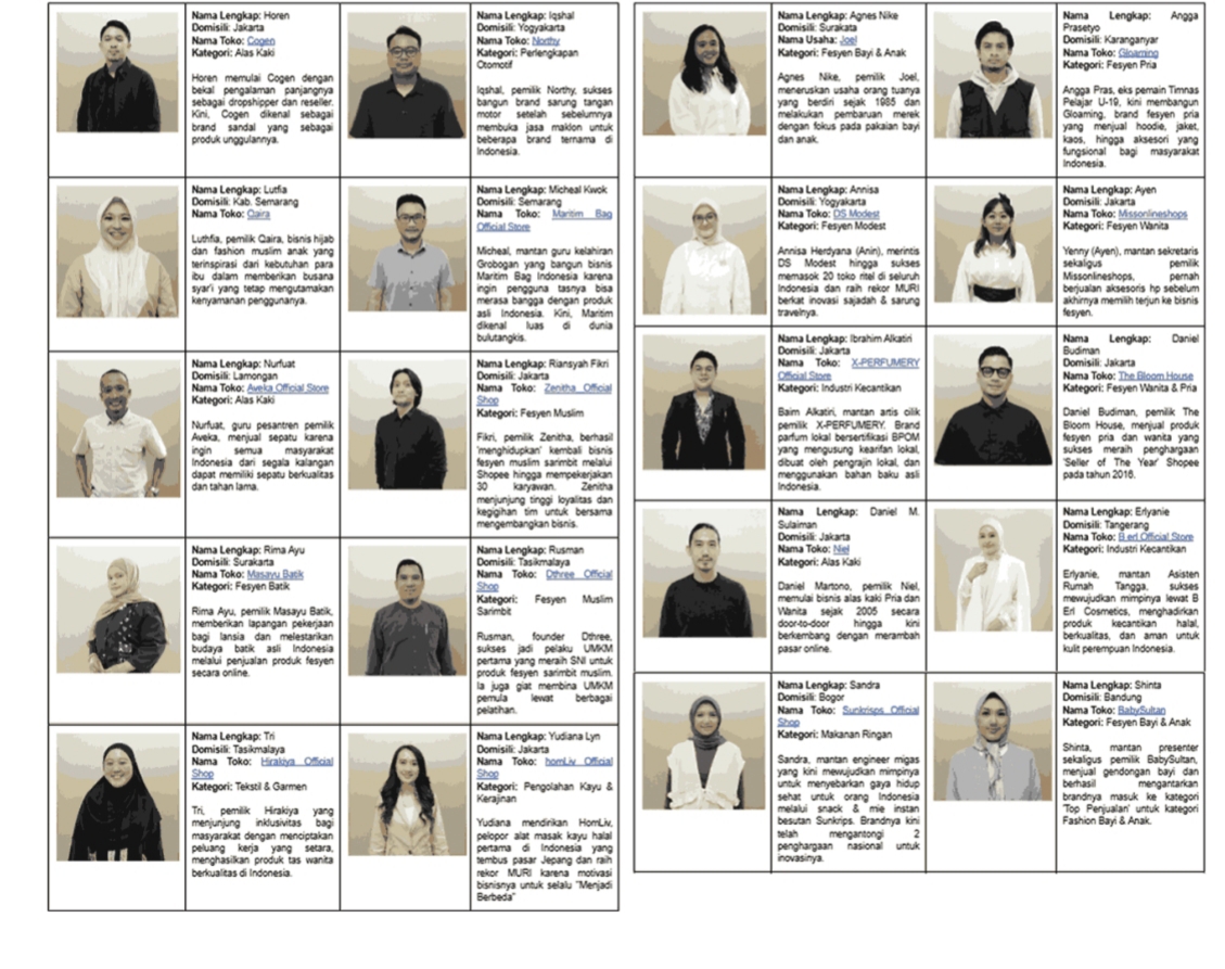 Berikut ini adalah profil singkat dari peringkat 20 besar Shopee Jagoan UMKM Naik Kelas