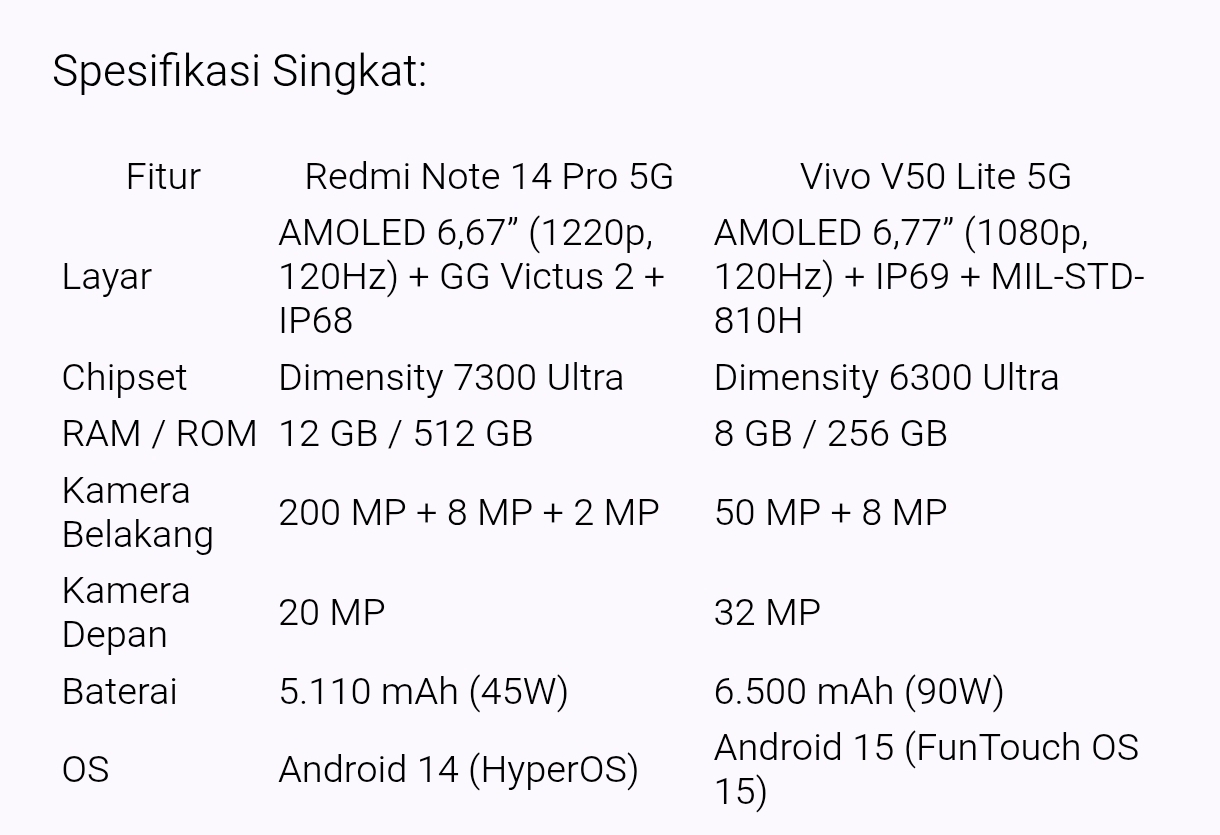 Perbandingan Redmi Note 14 Pro 5G vs Vivo V50 Lite 5G